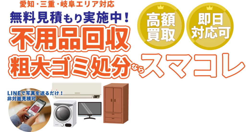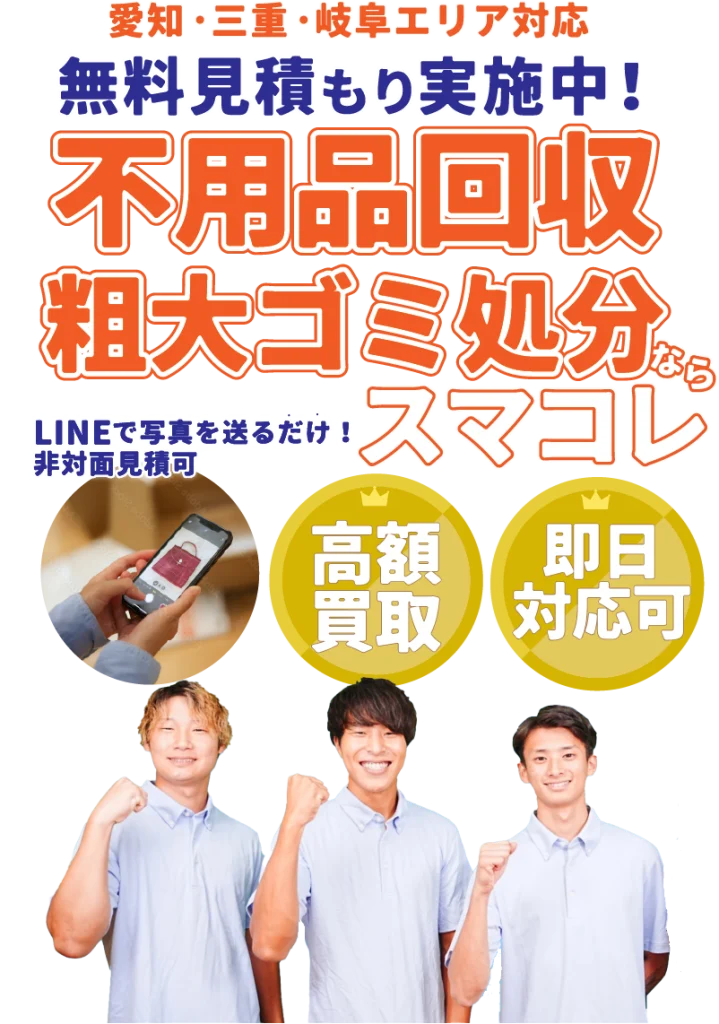 ※上記キャンペーンは、予告なく終了する場合がございます。あらかじめご了承くださいませ。 不用品回収や粗大ゴミ処分で こんなお悩みありませんか? 時間も人手も足りない 荷物を運ぶトラックや車を持っていない 片付けがうまくできない 引っ越しで思いのほかゴミが出た たくさん物があるので料金が心配 昼間は仕事に出るので業者には頼みづらい 粗大ゴミの日まで待てない 女性なので家に上がられて大丈夫か不安 マンションなので自分では荷物を運べない ↑ こちらをクリック! ↑ \ スマコレが解決します!/ スマコレが選ばれる3つの理由 理由1 非対面見積もりが可能 公式LINEをご登録いただき、商品の写真をお送りいただくことで非対面でお見積り(概算)が可能です。時間をとらず、商品を選ばず、1人でも簡単に見積できます。 理由2 若手スタッフの迅速作業 20代が中心となって活躍しています。 「迅速・丁寧・安全」に、当社スタッフがお客様に満足いただけるサービスをご提供いたします。 理由3 追加料金は一切なし! 「最初の見積もりと値段が違う」「オプションで追加費用を取られた」そんな経験はありませんか?当社では、最初にお見積もりでご提示した金額以上にご請求することは一切ありません。安心してご依頼ください。 \スマコレの他社に負けないところ/ 遺品整理士認定協会のお墨付き スマコレは、遺品整理士認定協会より、適切に遺品整理を行う優良企業として認定されています。安心してご利用ください。 優秀な遺品整理士が在籍 遺品整理の知識やマナーなどを習得した遺品整理士が在籍しています。大切なご遺品を丁寧に整理いたします お客様の声 voice 誠実で丁寧な対応をしていただきました 愛知県・M様 ⾃治体に引き取りを頼むには⾯倒な量だったので、まとめて回収・処分をお願いしたのですが、1 品ずつ丁寧に仕分けた後に回収してくれ、いくつかは買取りまでしてもらえました。⼿放すことになったとはいえ⼤切な収集品だったので、誠実に対応してもらえて嬉しく思いました。作業の⾳や周りの住⼈の邪魔にならないか気を配って作業されていて、とても誠実なスタッフさん達という印象でした。 捨てられなかった不用品がスッキリ 三重県・Y様 捨てよう捨てようと思いながらも、捨てられず、粗⼤ゴミと不⽤品が混ざり合った状況に⾜踏みし、困っていましたが、早くスマコレさんにご相談して良かったと⼼から思います。対応してくれたスタッフさんが丁寧に話を聞いてくれたおかげで、胸の内を包み隠さずに話せましたし、お願いした通りに⽚付いていく部屋を⾒てとてもホッとしました。この度は本当にありがとうございました。 処分のつもりが買取までしていただきました 愛知県・T様 ⼤阪から引越しをする準備として不要になった家具や服、⽇⽤品を処分したくて依頼しました。引越しの準備が忙しく⾃治体による回収よりも早く粗⼤ゴミを⽚付けたかったので助かりました。買ったばかりの家電やスポーツ⽤品や⼩物なども買取品として引き取ってもらい、処分費⽤を節約できたので嬉しかったです。 即日対応に大変助かりました 岐阜県・O様 引越しを⾏った際に以前住んでいた家の退去⽇が近くなり、粗⼤ゴミを頼もうとしたのですが、間に合わないとのことで、急いでインターネットで調べてご依頼させていただきました。電話したその⽇に家の不⽤品を回収していただき、助かりました。ありがとうございます。また機会があればよろしくお願いします。 回収料金の目安について price 一人暮らし(1K〜1LDK) ご家族(2LDK〜4LDK) ゴミ屋敷・遺品整理 要相談 (目安:50,000円~150,000円) ※上記は目安料金であり、実際のお見積りは異なる場合がございます。一人暮らしの方でもLパックになることや、ご家族の方でもSパックになることはあります。※WEB割引は上記の金額からお値引きさせていただきます。 クレジットカードOK 損害賠償保険もあり 行政と民間の不用品回収業者の違い 自治体による不用品・粗大ゴミ回収と回収業者との大まかな違いは、回収までにかかる時間と回収後の処理が挙げられます。 自治体は回収後適切に処分してもらえる代わりに待ち時間がかかるのに対して、業者は待ち時間が短くなる代わりに、不用品・粗大ゴミを適切に処理している業者か事前に調査する手間がかかります。どちらになら安心して任せられるかを判断材料にするのもおすすめです。 主なサービス Main Service 不用品回収 粗大ゴミから事業系ゴミまで幅広く搬出・回収いたします。 粗大ごみ処分 粗大ゴミを早急く処分したい、自治体よりも迅速に回収・処分します。 家具回収 小さくなった家具から、大型のタンスまでお引き取りが可能です。 家電回収 処分が簡単にできないパソコンや大型家電も回収可能です! 廃品回収 分別や処分の方法がわからない廃品も回収し処分します。 不用品買取 再利用できるもの無料で査定!買取金を料金から差し引くこともできます。 引越しサポート 荷