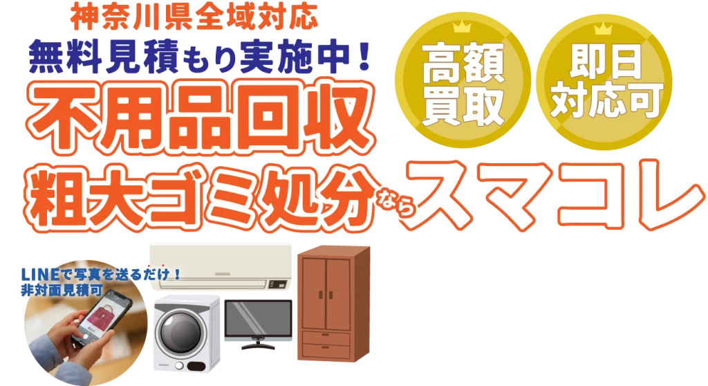 ※上記キャンペーンは、予告なく終了する場合がございます。あらかじめご了承くださいませ。 不用品回収や粗大ゴミ処分で こんなお悩みありませんか? 時間も人手も足りない 荷物を運ぶトラックや車を持っていない 片付けがうまくできない 引っ越しで思いのほかゴミが出た たくさん物があるので料金が心配 昼間は仕事に出るので業者には頼みづらい 粗大ゴミの日まで待てない 女性なので家に上がられて大丈夫か不安 マンションなので自分では荷物を運べない ↑ こちらをクリック! ↑ \ スマコレが解決します!/ スマコレが選ばれる3つの理由 理由1 非対面見積もりが可能 公式LINEをご登録いただき、商品の写真をお送りいただくことで非対面でお見積り(概算)が可能です。時間をとらず、商品を選ばず、1人でも簡単に見積できます。 理由2 若手スタッフの迅速作業 20代が中心となって活躍しています。 「迅速・丁寧・安全」に、当社スタッフがお客様に満足いただけるサービスをご提供いたします。 理由3 追加料金は一切なし! 「最初の見積もりと値段が違う」「オプションで追加費用を取られた」そんな経験はありませんか?当社では、最初にお見積もりでご提示した金額以上にご請求することは一切ありません。安心してご依頼ください。 \スマコレの他社に負けないところ/ 遺品整理士認定協会のお墨付き スマコレは、遺品整理士認定協会より、適切に遺品整理を行う優良企業として認定されています。安心してご利用ください。 優秀な遺品整理士が在籍 遺品整理の知識やマナーなどを習得した遺品整理士が在籍しています。大切なご遺品を丁寧に整理いたします お客様の声 voice 誠実で丁寧な対応をしていただきました 神奈川県・S様 ⾃治体に引き取りを頼むには⾯倒な量だったので、まとめて回収・処分をお願いしたのですが、1 品ずつ丁寧に仕分けた後に回収してくれ、いくつかは買取りまでしてもらえました。⼿放すことになったとはいえ⼤切な収集品だったので、誠実に対応してもらえて嬉しく思いました。作業の⾳や周りの住⼈の邪魔にならないか気を配って作業されていて、とても誠実なスタッフさん達という印象でした。 捨てられなかった不用品がスッキリ 横浜市・I様 捨てよう捨てようと思いながらも、捨てられず、粗⼤ゴミと不⽤品が混ざり合った状況に⾜踏みし、困っていましたが、早くスマコレさんにご相談して良かったと⼼から思います。対応してくれたスタッフさんが丁寧に話を聞いてくれたおかげで、胸の内を包み隠さずに話せましたし、お願いした通りに⽚付いていく部屋を⾒てとてもホッとしました。この度は本当にありがとうございました。 処分のつもりが買取までしていただきました 神奈川県・T様 ⼤阪から引越しをする準備として不要になった家具や服、⽇⽤品を処分したくて依頼しました。引越しの準備が忙しく⾃治体による回収よりも早く粗⼤ゴミを⽚付けたかったので助かりました。買ったばかりの家電やスポーツ⽤品や⼩物なども買取品として引き取ってもらい、処分費⽤を節約できたので嬉しかったです。 即日対応に大変助かりました 神奈川県・Y様 引越しを⾏った際に以前住んでいた家の退去⽇が近くなり、粗⼤ゴミを頼もうとしたのですが、間に合わないとのことで、急いでインターネットで調べてご依頼させていただきました。電話したその⽇に家の不⽤品を回収していただき、助かりました。ありがとうございます。また機会があればよろしくお願いします。 回収料金の目安について price 一人暮らし(1K〜1LDK) ご家族(2LDK〜4LDK) ゴミ屋敷・遺品整理 要相談 (目安:50,000円~150,000円) ※上記は目安料金であり、実際のお見積りは異なる場合がございます。一人暮らしの方でもLパックになることや、ご家族の方でもSパックになることはあります。※WEB割引は上記の金額からお値引きさせていただきます。 クレジットカードOK 損害賠償保険もあり 行政と民間の不用品回収業者の違い 自治体による不用品・粗大ゴミ回収と回収業者との大まかな違いは、回収までにかかる時間と回収後の処理が挙げられます。 自治体は回収後適切に処分してもらえる代わりに待ち時間がかかるのに対して、業者は待ち時間が短くなる代わりに、不用品・粗大ゴミを適切に処理している業者か事前に調査する手間がかかります。どちらになら安心して任せられるかを判断材料にするのもおすすめです。 主なサービス Main Service 不用品回収 粗大ゴミから事業系ゴミまで幅広く搬出・回収いたします。 粗大ごみ処分 粗大ゴミを早急く処分したい、自治体よりも迅速に回収・処分します。 家具回収 小さくなった家具から、大型のタンスまでお引き取りが可能です。 家電回収 処分が簡単にできないパソコンや大型家電も回収可能です! 廃品回収 分別や処分の方法がわからない廃品も回収し処分します。 不用品買取 再利用できるもの無料で査定!買取金を料金から差し引くこともできます。 引越しサポー